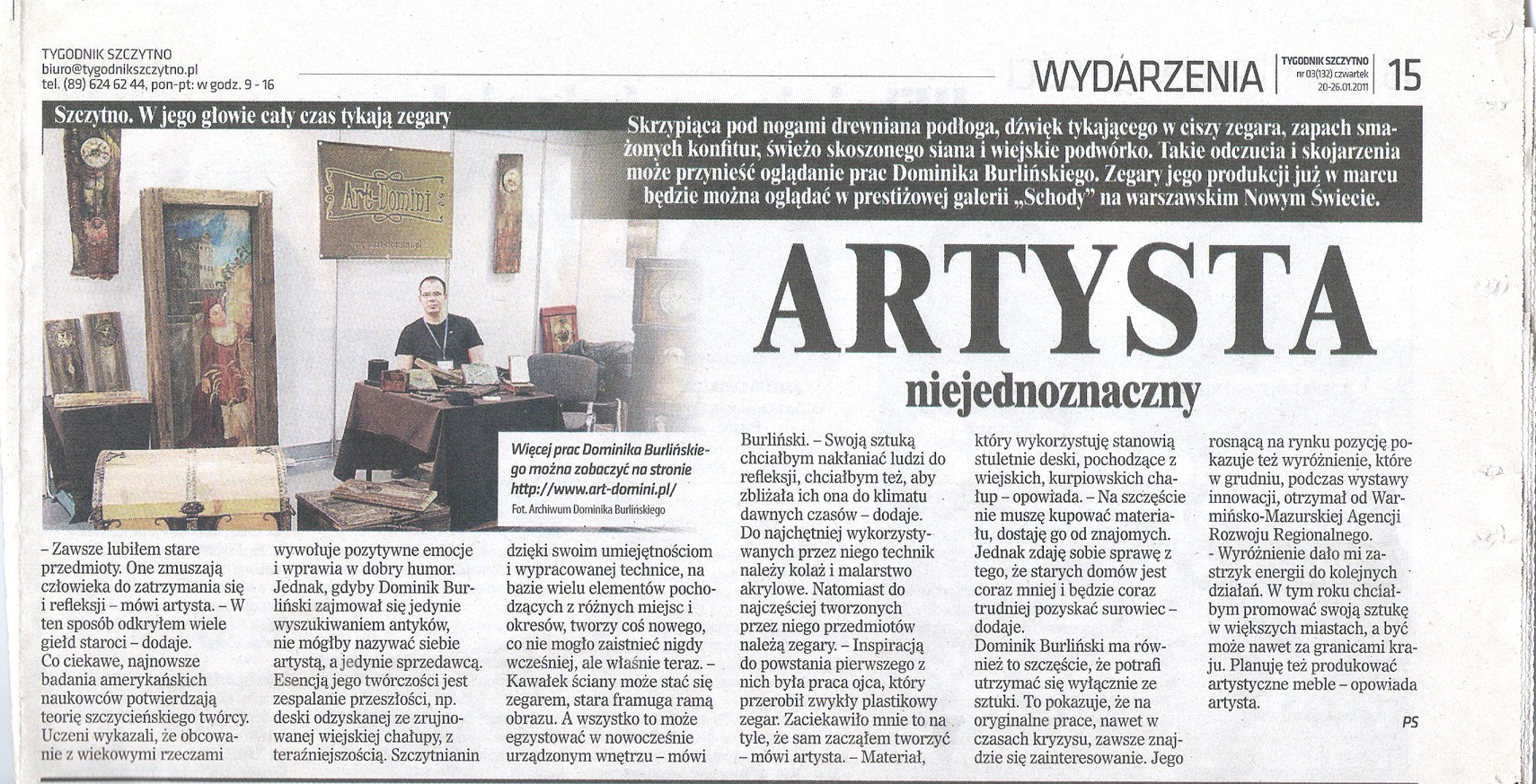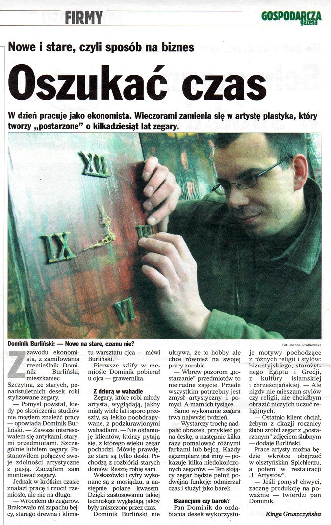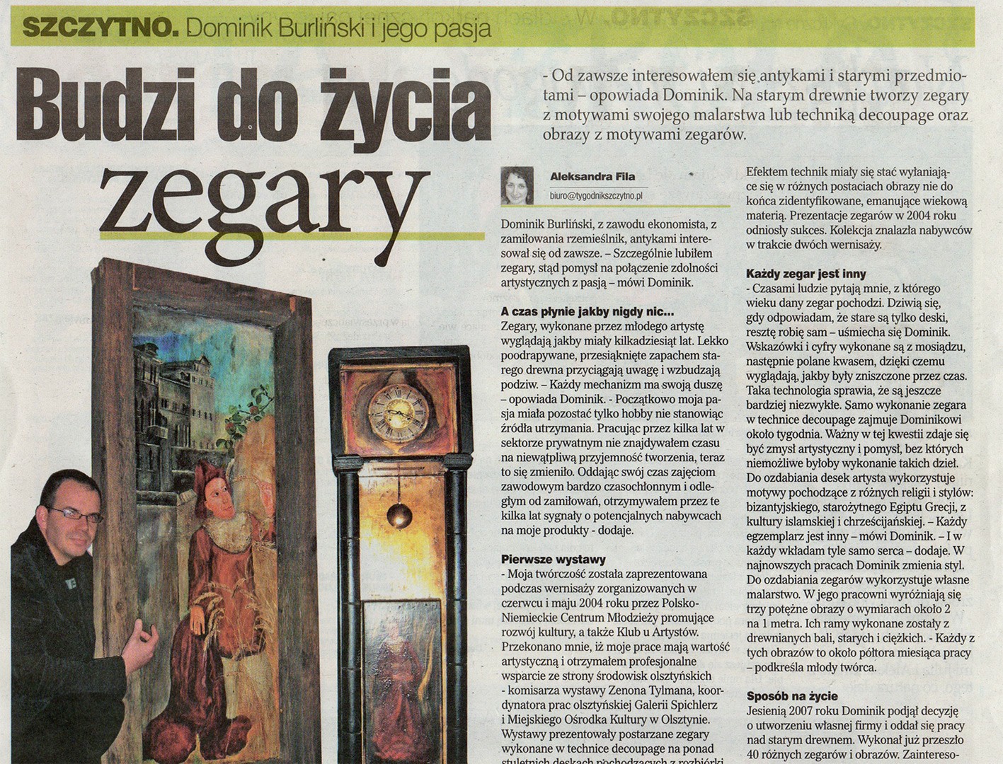 Before I started to paint… Around the year 2000, I experimented with collages which later decorated the walls of my own home. With time, I started using wooden boards recycled from old houses on which I installed mechanical and electronic clocks. The year 2004 brought first exhibitions and media coverage. The popularity of my work exceeded my expectations and, in 2007, I decided to turn it into business. After a few years, due to family reasons, I had to abandon my, still popular, artistic work and return to a job very remote from my passion. In the section "archive" there are a few works (currently unavailable) from the earlier period, i.e. clocks with motives of my paintings and collages.